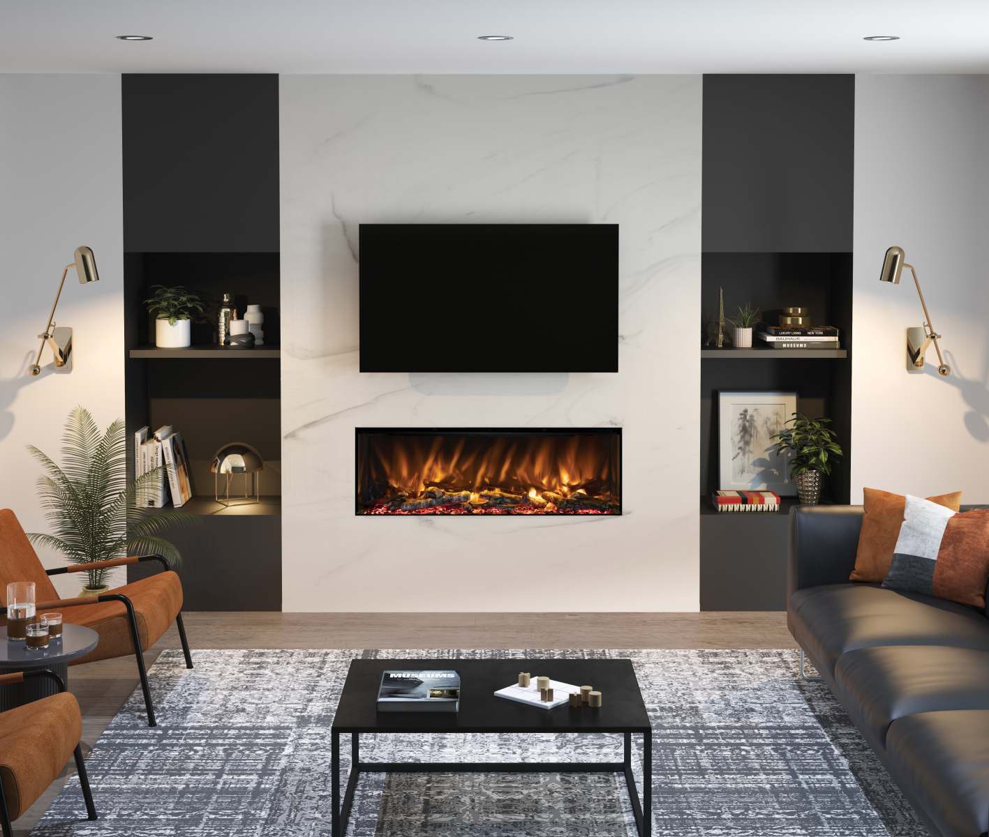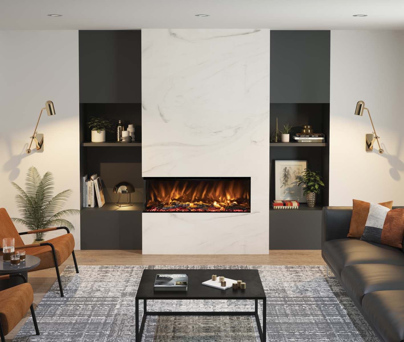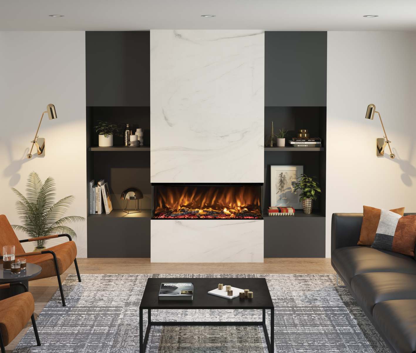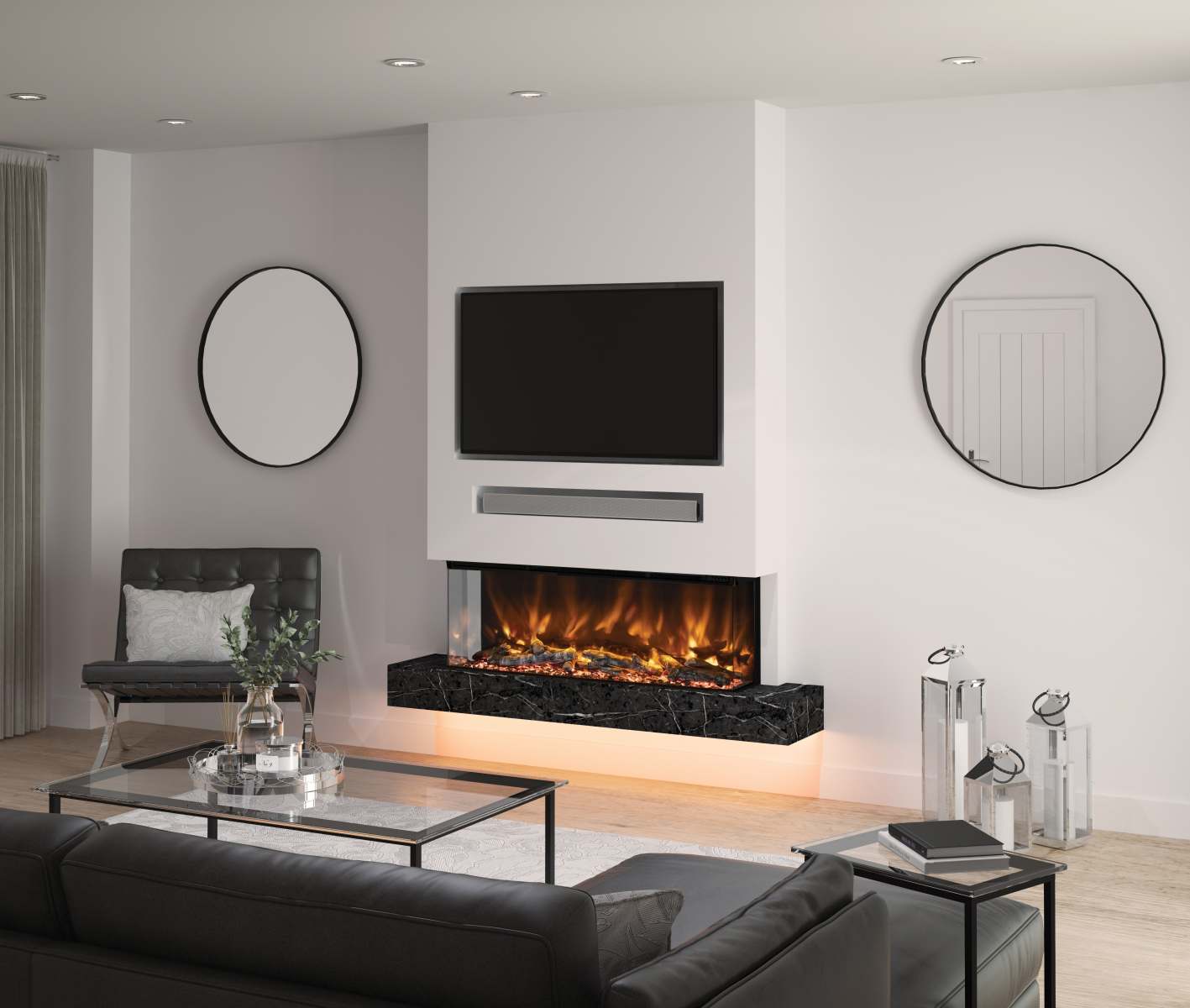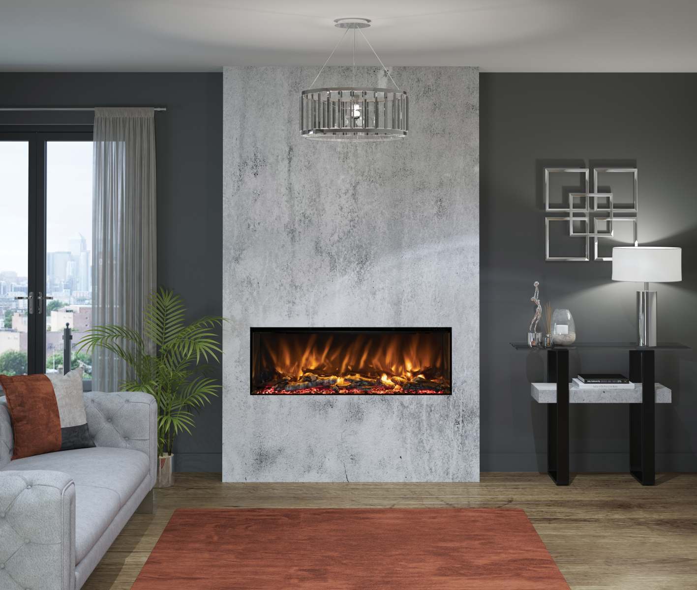 - 5D flame effect with three dimmable flame colour settings