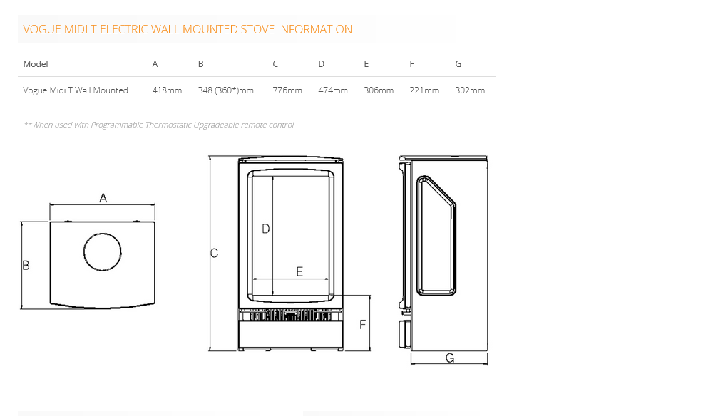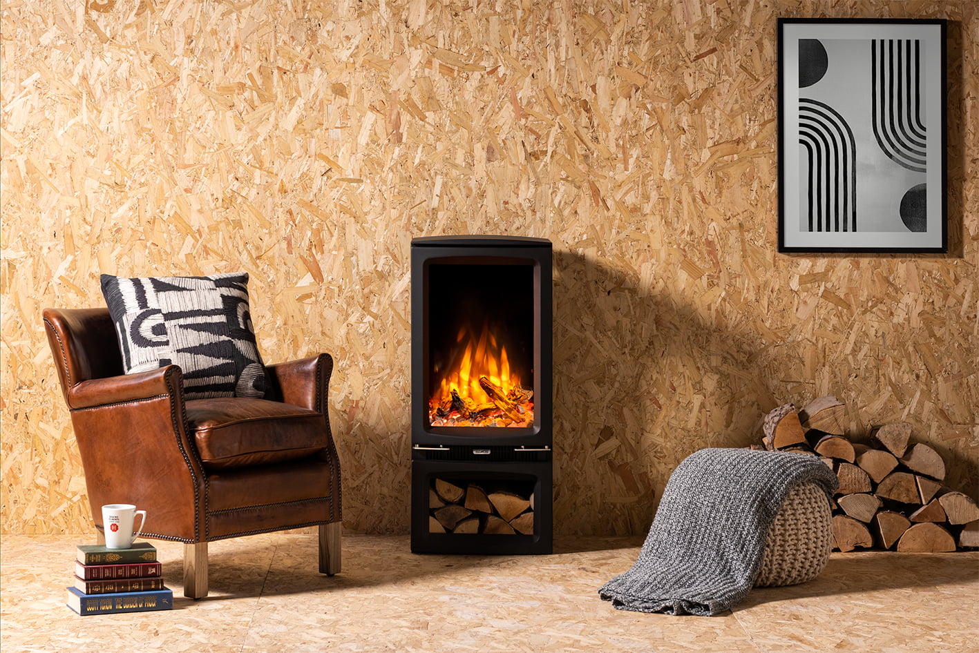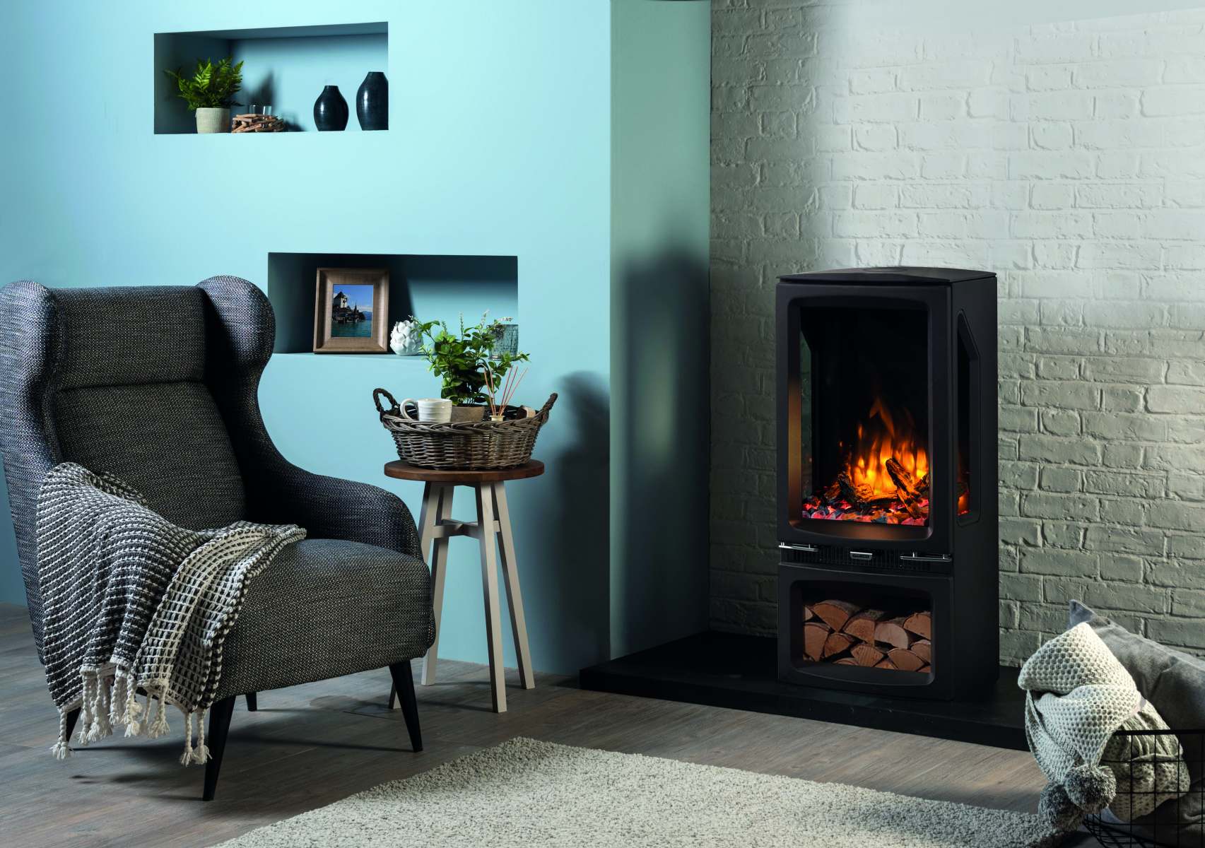 Three stove options including log store base and wall mounted models