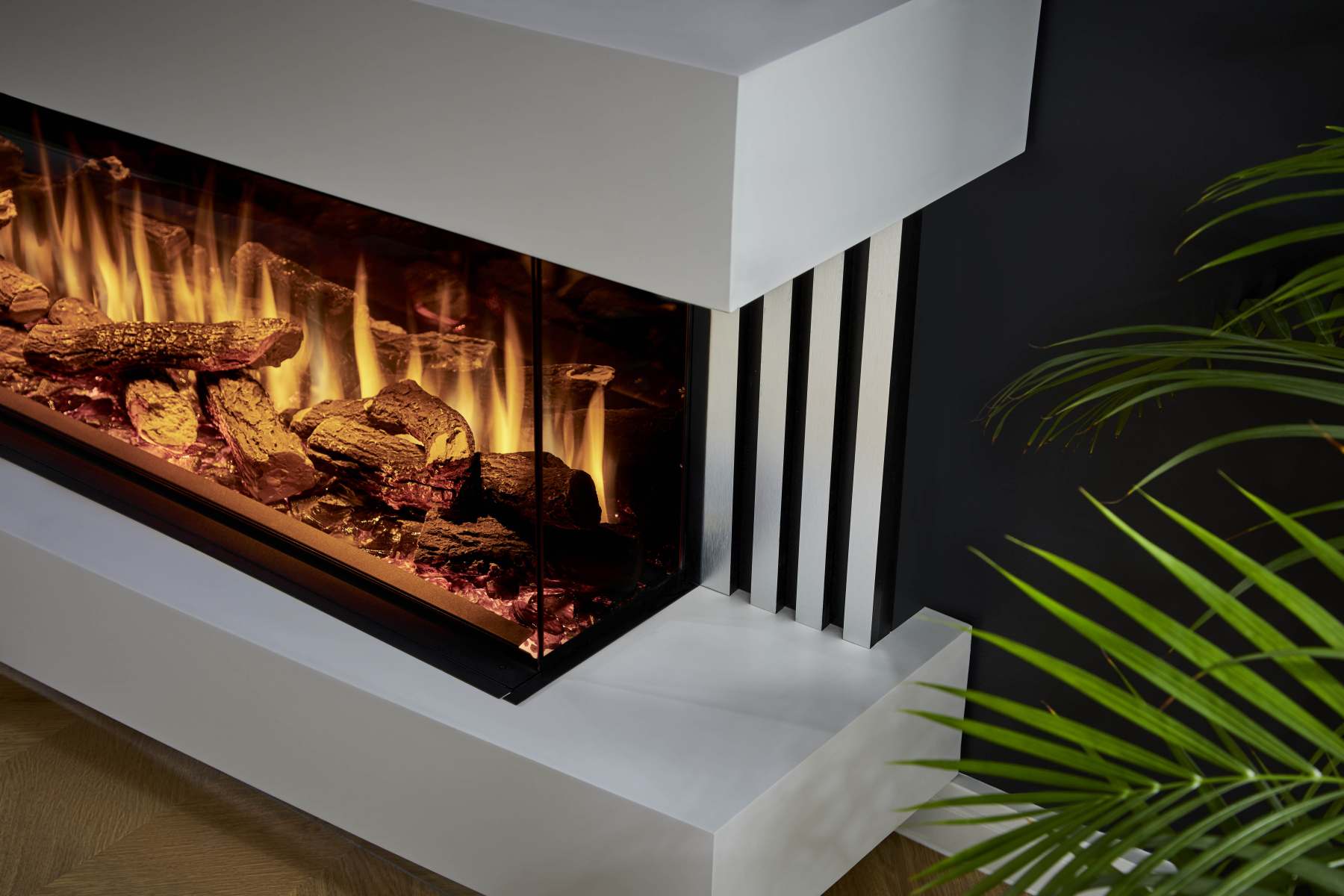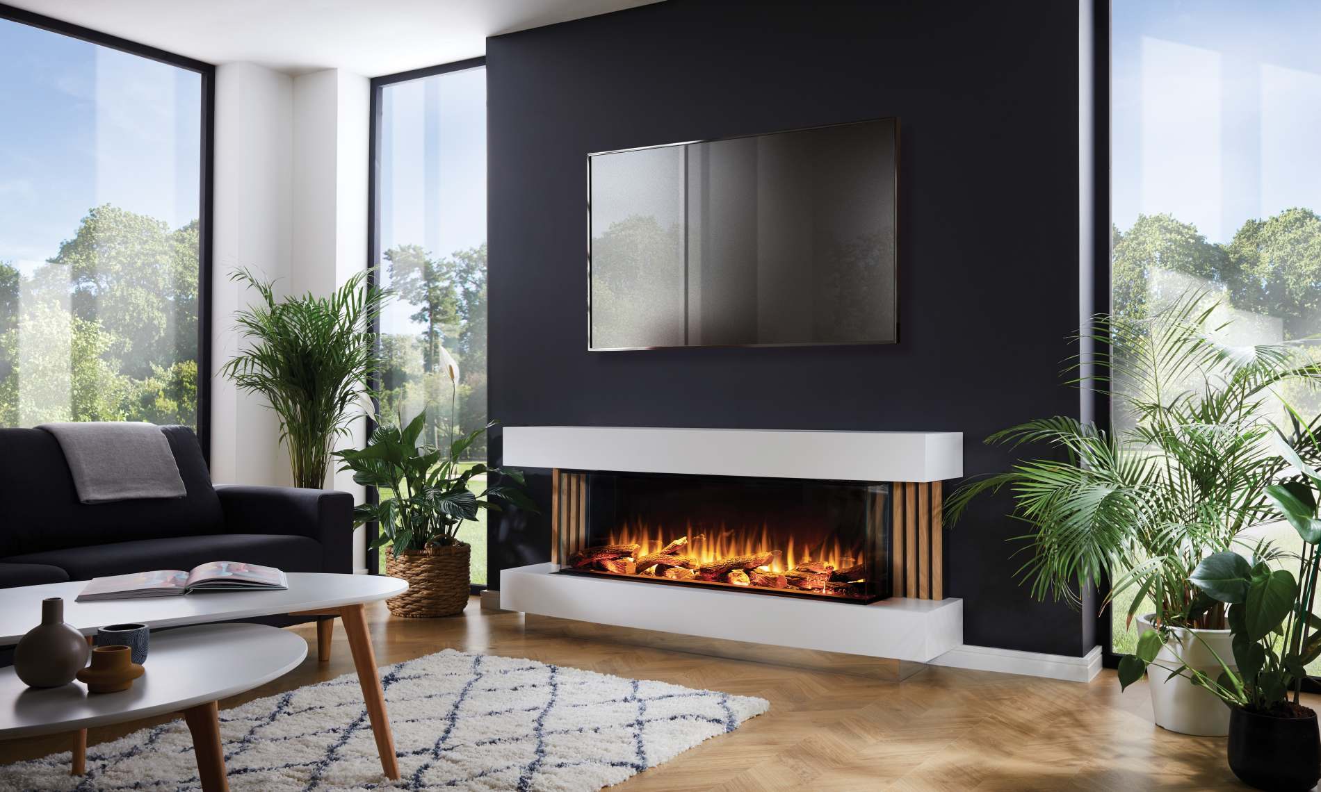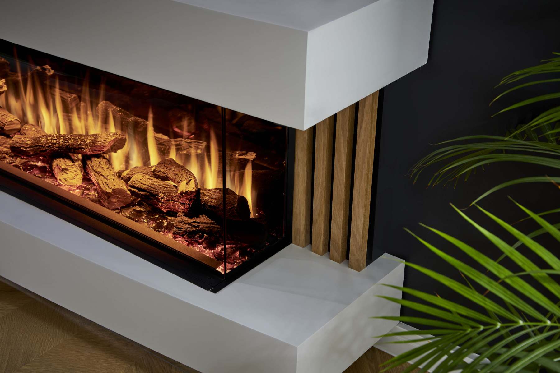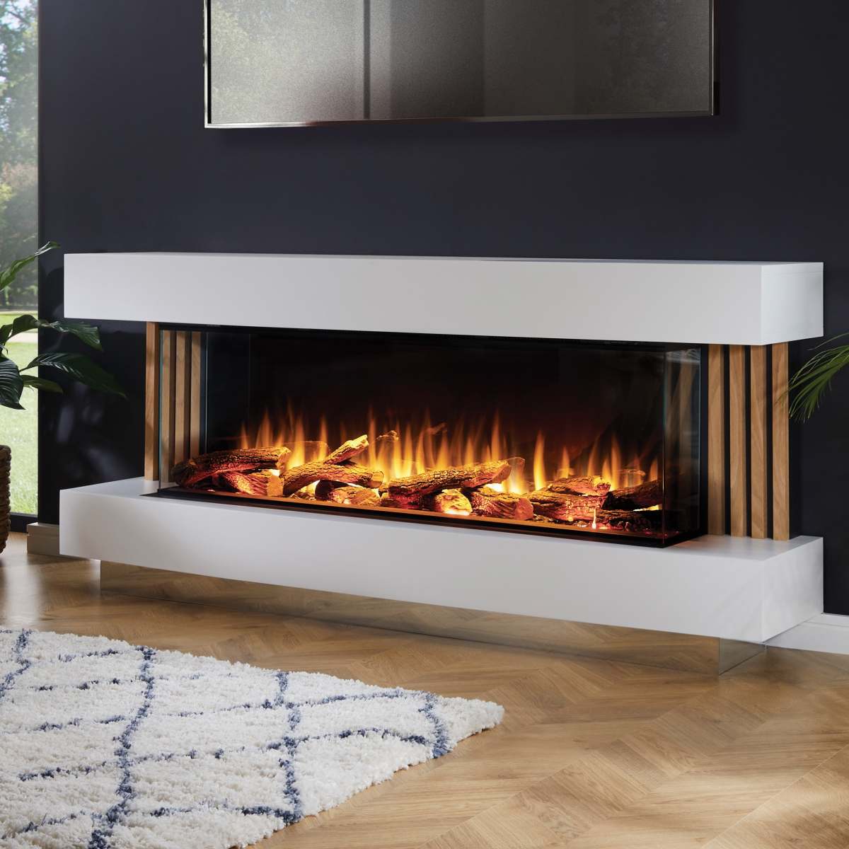 - Realistic Live flame effect with three colour options each available with four mood settings