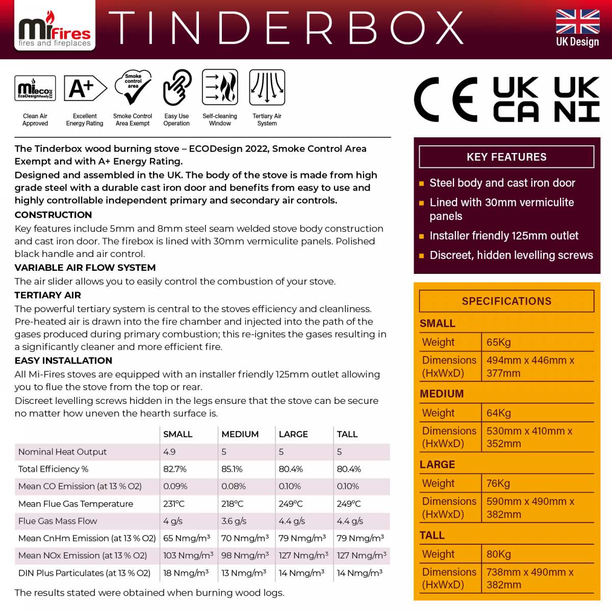 - Designed and assembled in the UK, these stoves are the most efficient of their size in the UK, together with the lowest emissions (Dust Particles) available today.